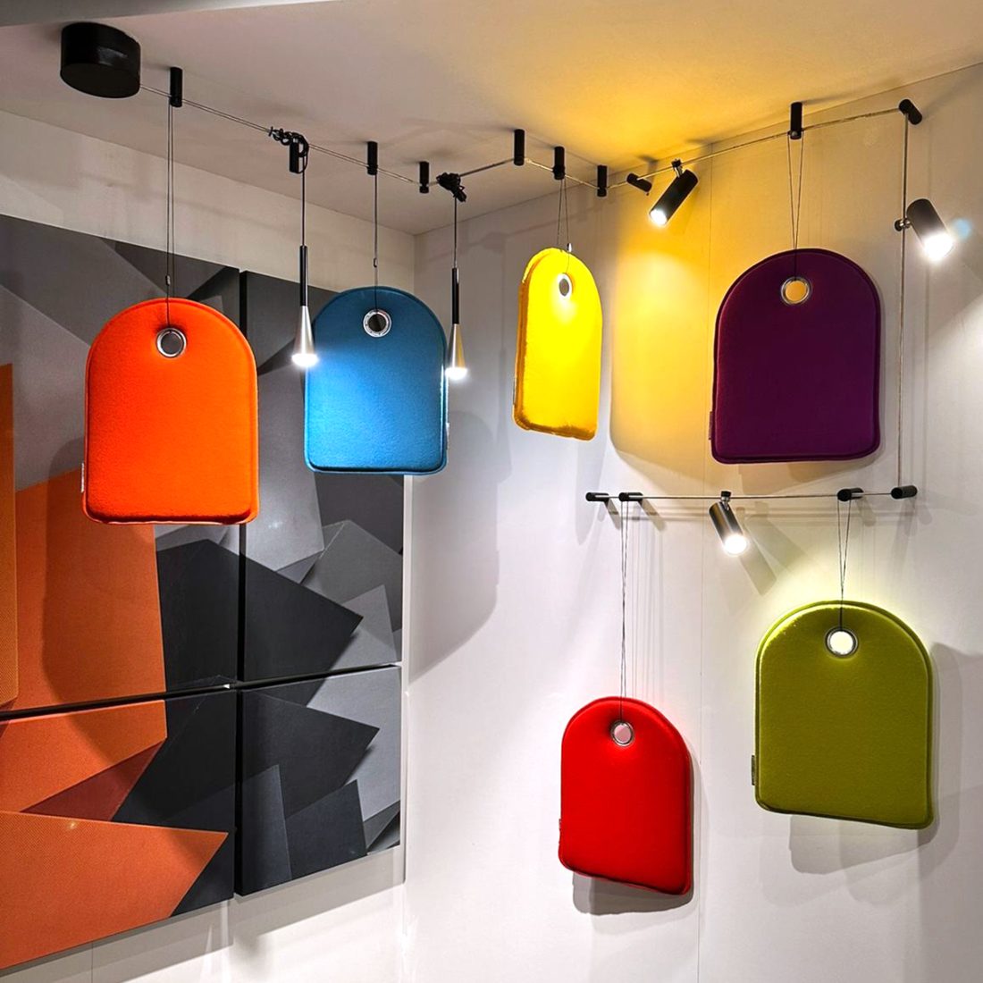 Serie di pannelli fonoassorbenti declinati in diversi formati e sistemi strutturali.